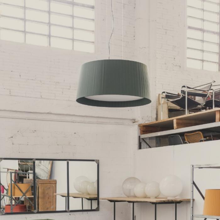 De GT5 Hanglamp is ontworpen door het Santa en Cole design team. Deze hanglamp heeft een katoenen plisse kap om een meer warme sfeer in een ruimte te kunnen brengen. Deze elegante hanglamp heeft een kap met een diameter van 62 cm en is 32 cm hoog. In de onderzijde van de kap bevindt zich een witte diffuser die zorgt voor een gelijkmatige spreiding van het licht en voorkomt dat u direct in de lichtbron kijkt. De lamp is verkrijgbaar in zes kleuren: naturel wit, rood, zwart, terracotta, mosterdgeel en groen. Het frame van de lamp is uitgevoerd in mat nickel en het snoer is verkrijgbaar in zwart of wit.