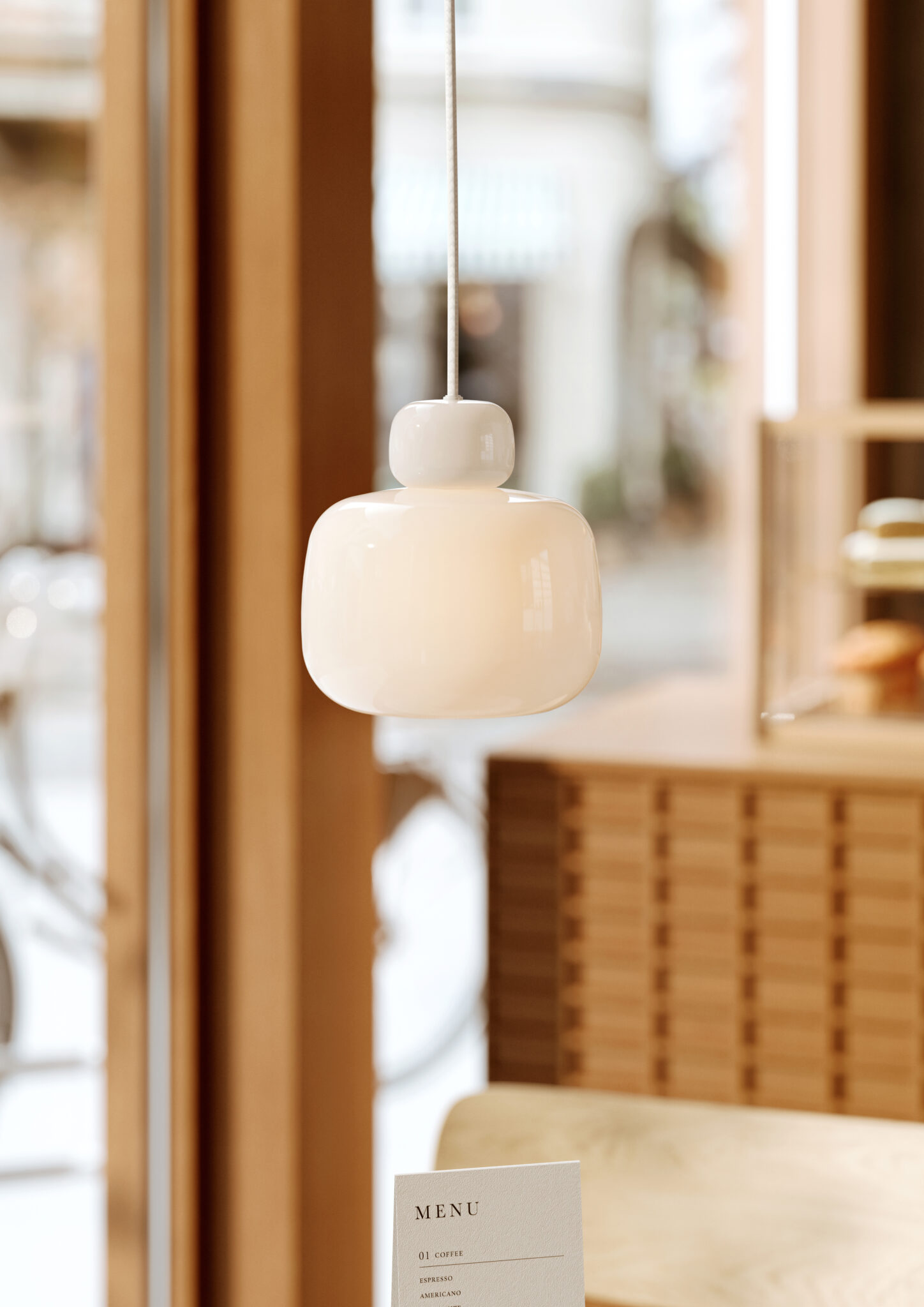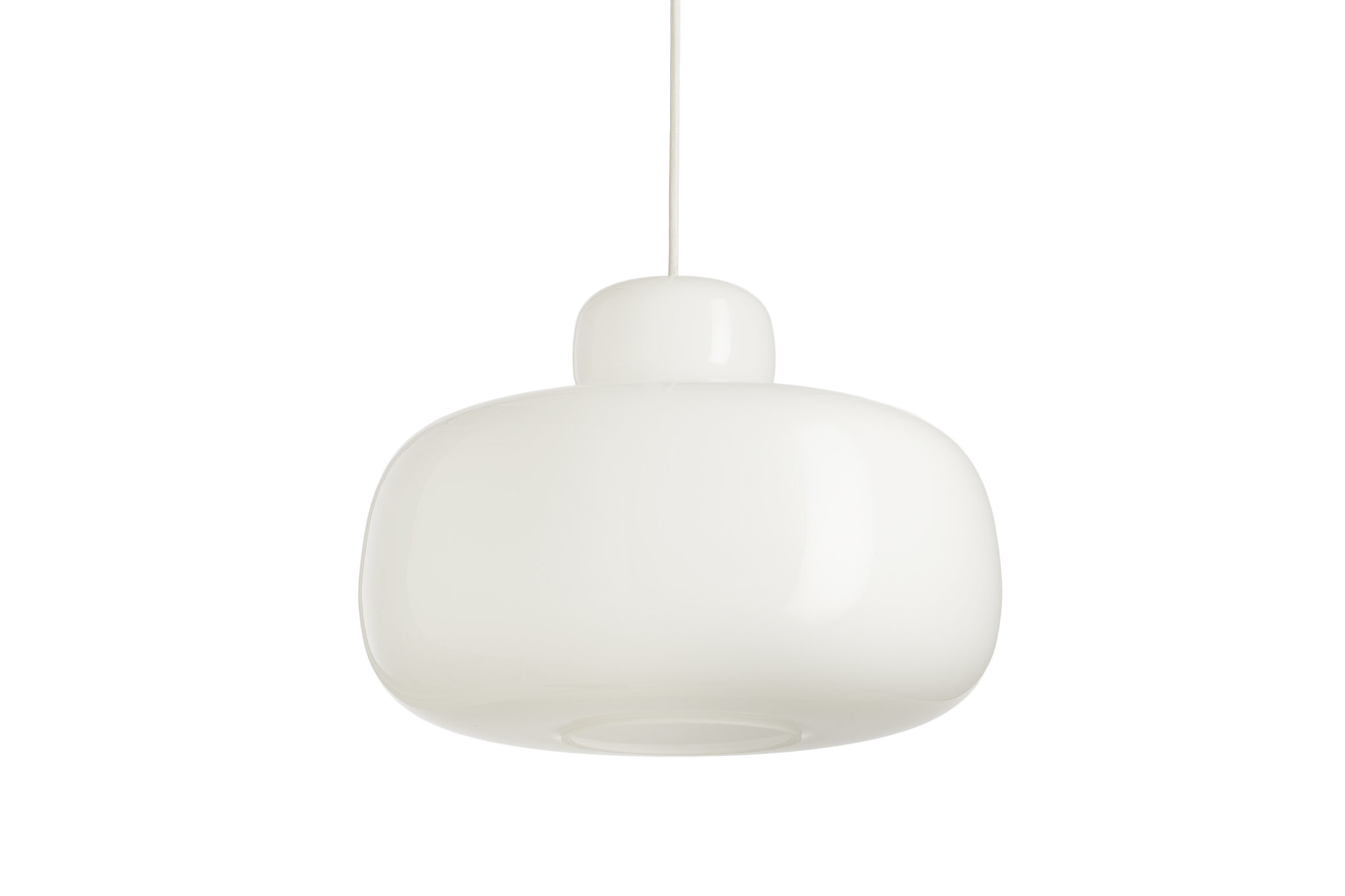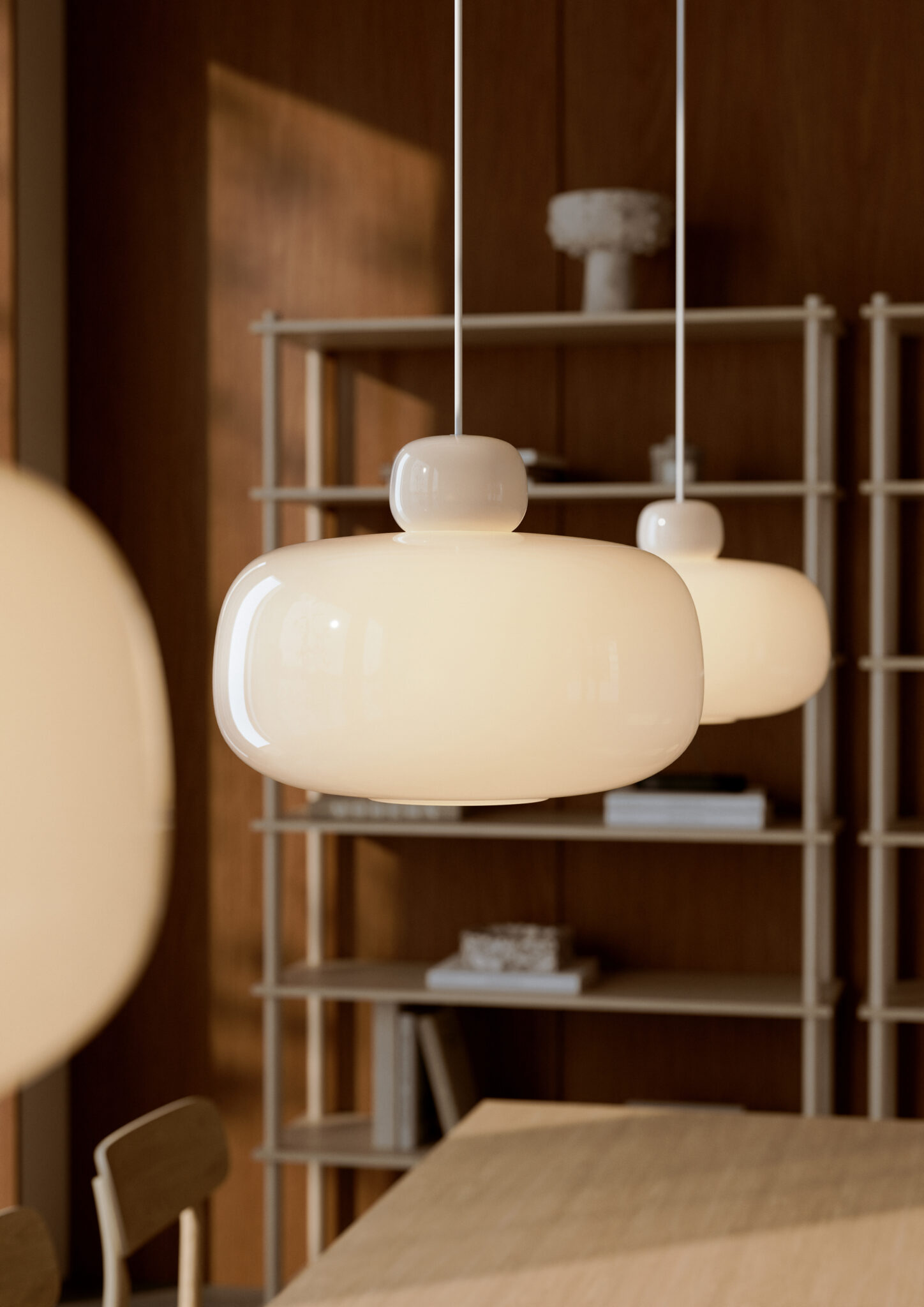 De Stone lamp glas is ontworpen door Philip Bro, hij heeft zich laten inspireren door de zachtheid van de vorm van Steenmannetjes. Dit zijn gestapelde meestal ronde stenen gevormd door de invloeden van water, zand en wind. Het stapelen stenen is een van de oudste menselijke uitdrukkingen die nog steeds wordt toegepast voor markeringen in het landschap. Dit zie je terug in de de organische vorm van de glazen kap. De Stone lamp was al leverbaar met een metalen kap en nu ook in twee formaten met een glazen kap. ordt geleverd in drie verschillende kleuren, wit, zwart en mosterd geel. De Stone lamp small heeft een diameter van 16 cm, de Stone lamp glas large heeft een diameter van 36 cm.