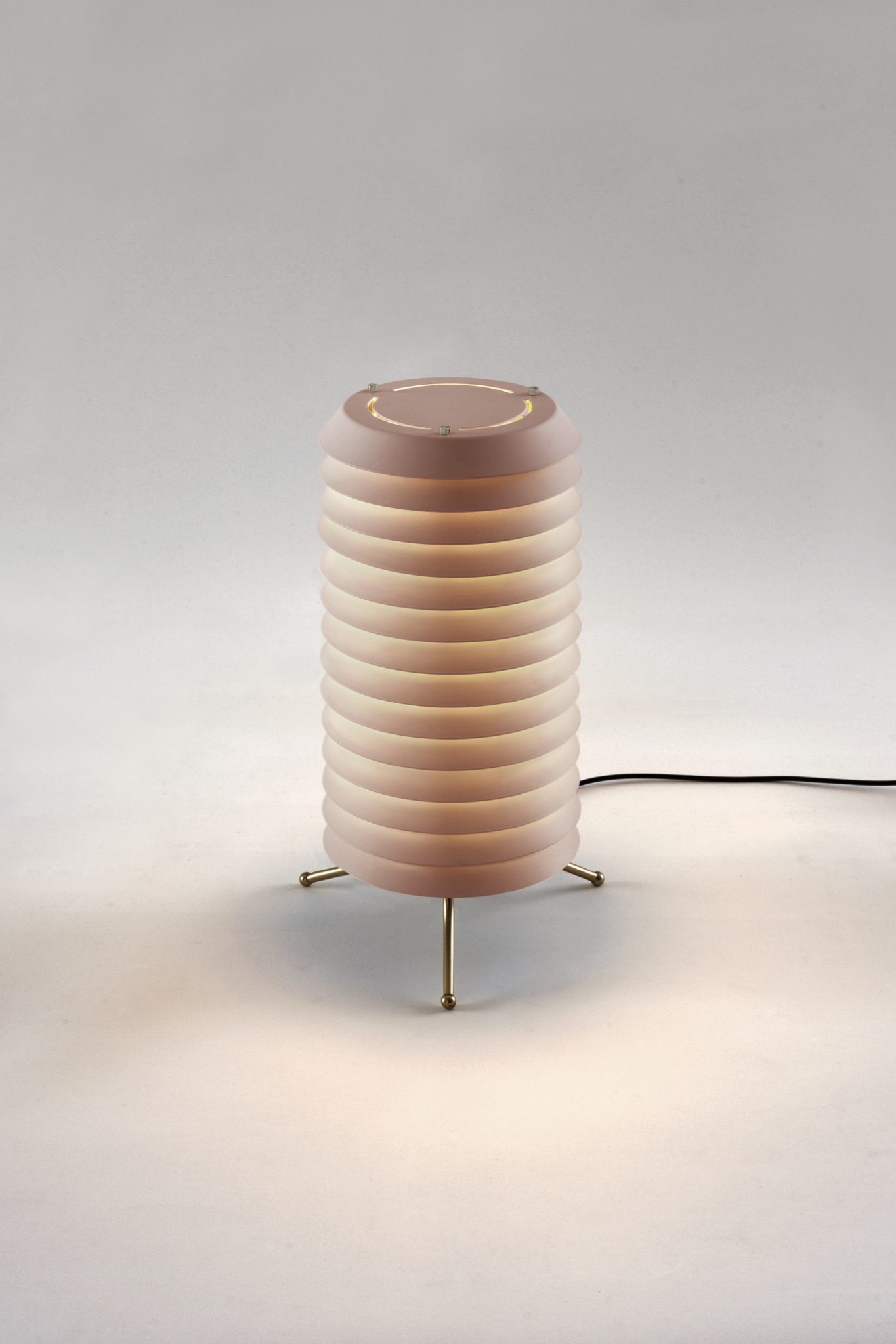 De Maija Tafellamp is in 1955 ontworpen Ilmari Tapiovaara, een Finse Designer. Hij heeft zich laten inspireren door het kinderboek Maja de Bij uit 1912. En met name de Bijenkast met zijn verschillende lagen. Het resultaat is de Maija Tafellamp met de liggende schijven waaruit het licht komt als uit een glinsterende honingraat. Bij het originele ontwerp waren de schijven Rose, deze uitvoering is nu weer verkrijgbaar naast de uitvoering met de Witte schijven. Bij beide uitvoeringen is het onderstel wat bestaat uit 3 voetjes uitgevoerd in mat koper. De Maija Tafellamp is door Santa en Cole nu voorzien van milieuvriendelijke LED verlichting en een dimmer, de lamp is 33 cm hoog en heeft een diameter van 18 cm.