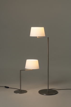 De Americana Vloerlamp is ontworpen door Miguel Mila voor het Spaanse label Santa Cole. Midden jaren zestig heeft Miguel Mila de Americana serie ontworpen als hulde aan de collectie van George Hansen uit de jaren vijftig. Net als de Hansen lampen heeft de Americana serie een roterende arm. De arm met de kap kan je naar je toe bewegen om de lamp te gebruiken als handige leeslamp. De kap is van wit linnen en de staander en de voet zijn satijn nikkel. De hoogte van de lamp is 112 cm, de diameter van de kap is 25 cm.