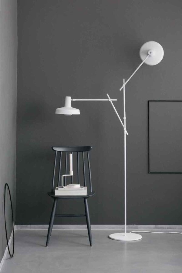 De Arigato Vloerlamp AR-F2 is ontworpen door Grupa is de dubbel armige vloerlamp. De Arigato lampen kenmerken zich door industriële vormgeving en comfortabel licht. De Arigato Vloerlamp is ca 175 cm hoog, de kappen hebben een diameter van 22 cm. De dubbele vloerlamp is verkrijgbaar in satijn zwart of satijn wit. De Arigato vloerlamp is door de dubbele koppelingen en de draaibare kap optimaal verstelbaar en erg geschikt als leeslamp of om objecten aan te lichten. Het scherm in de kappen zorgt er voor dat je niet verblind wordt door de lichtbron. De Arigato serie bestaat uit vloerlampen, wandlampen, plafondlampen en hanglampen. Klik voor een overzicht op : Arigato lampen.