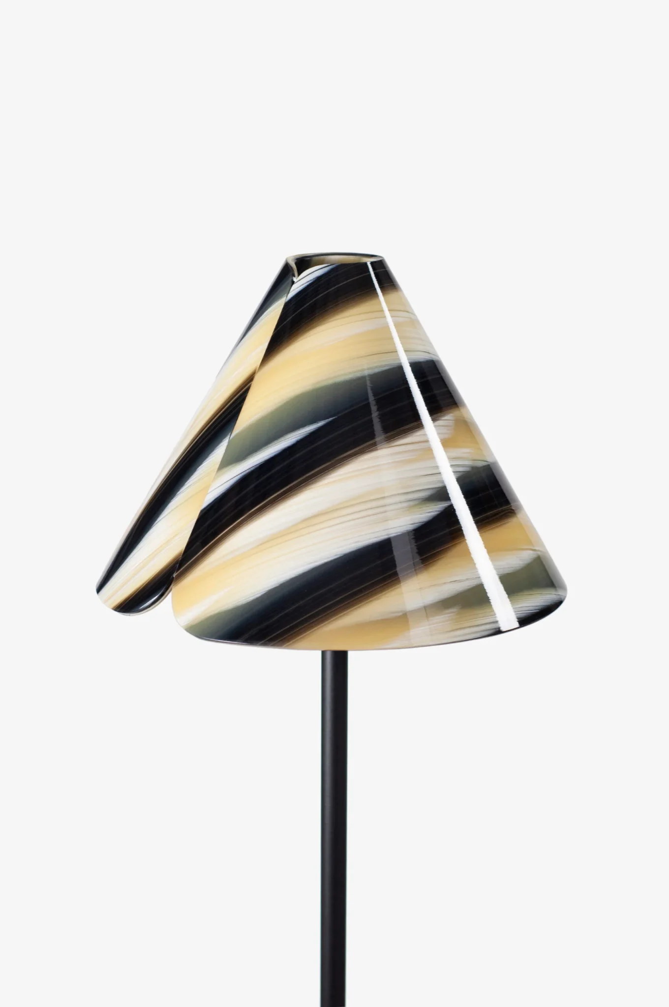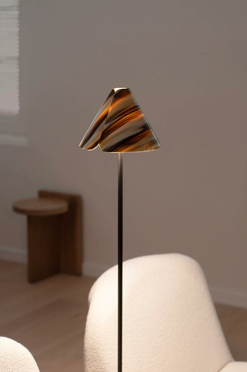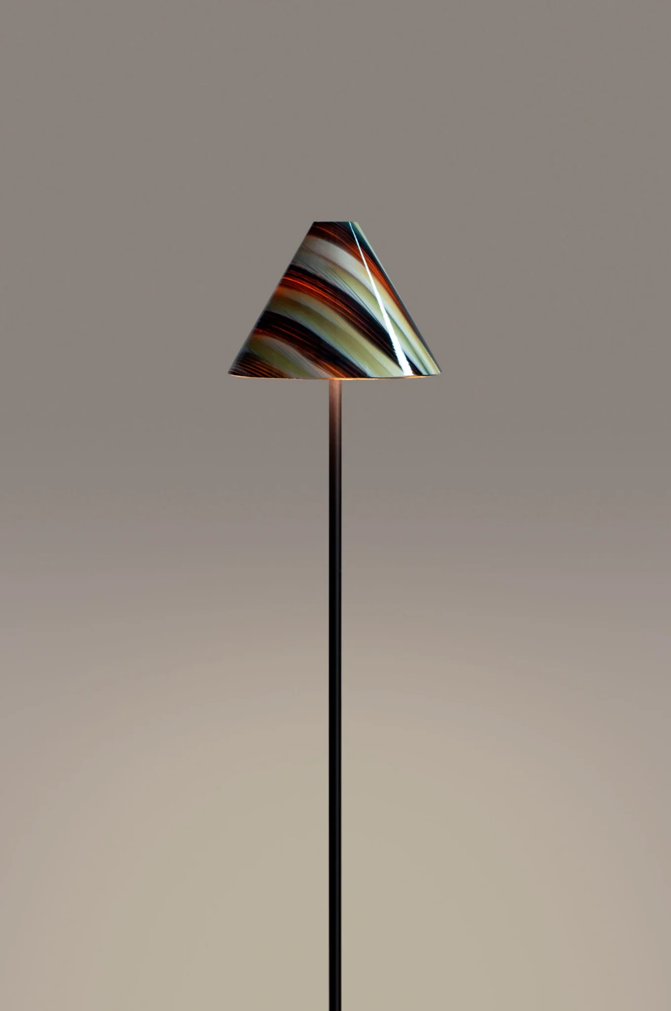 De Pisco vloerlamp Horn is ontworpen door Goula en Figuera voor het Spaanse merk Gofi. Het is een vloerlamp met een kap gemaakt van Italiaans celluloseacetaat, een materiaal wat tot nu toe voornamelijk werd gebruikt voor de productie van luxe brillen. De handmatige verwerking van het acetaat zorgt ervoor dat er geen twee stukken identiek zijn en dat de kleurencombinaties met geen enkel ander materiaal reproduceerbaar zijn. Hierdoor is elke kap van de Pisco lamp uniek en spectaculair. De diameter van de kap is 20 cm, de hoogte van de lamp is 134 cm en de lengte van de zwarte kabel met aan/uit schakelaar is 200 cm. De Pisco vloerlamp is ook verkrijgbaar met een kap in Tortoise of Havana Sand.
