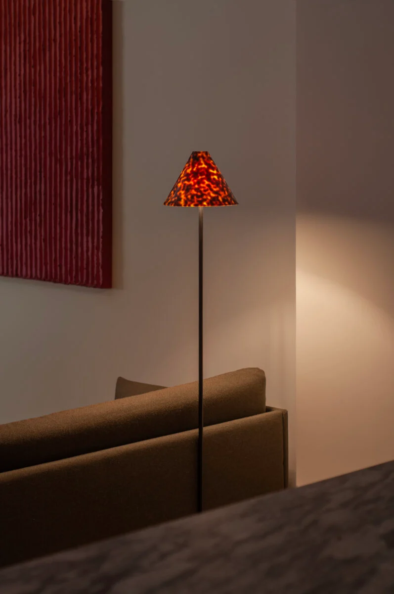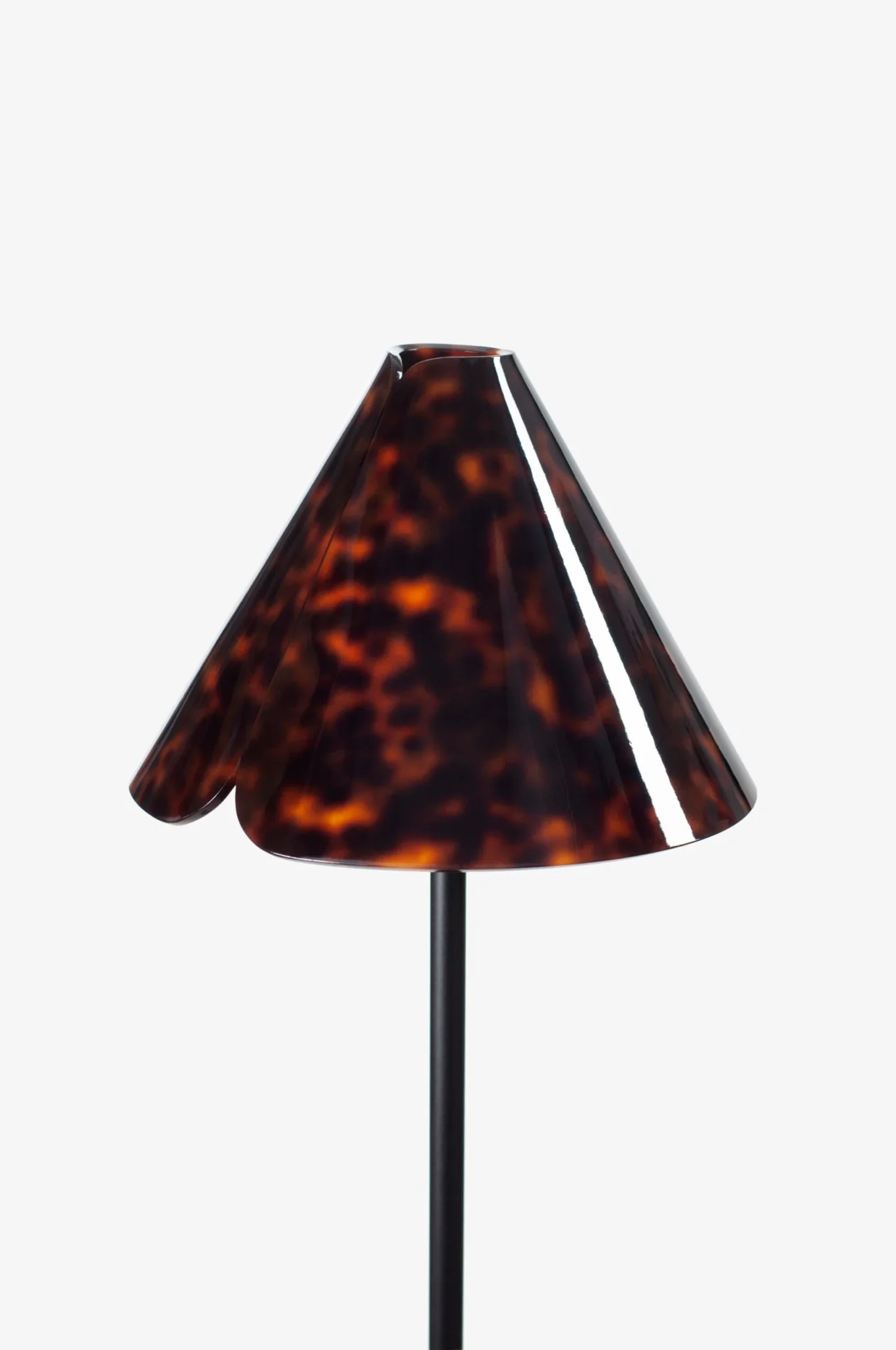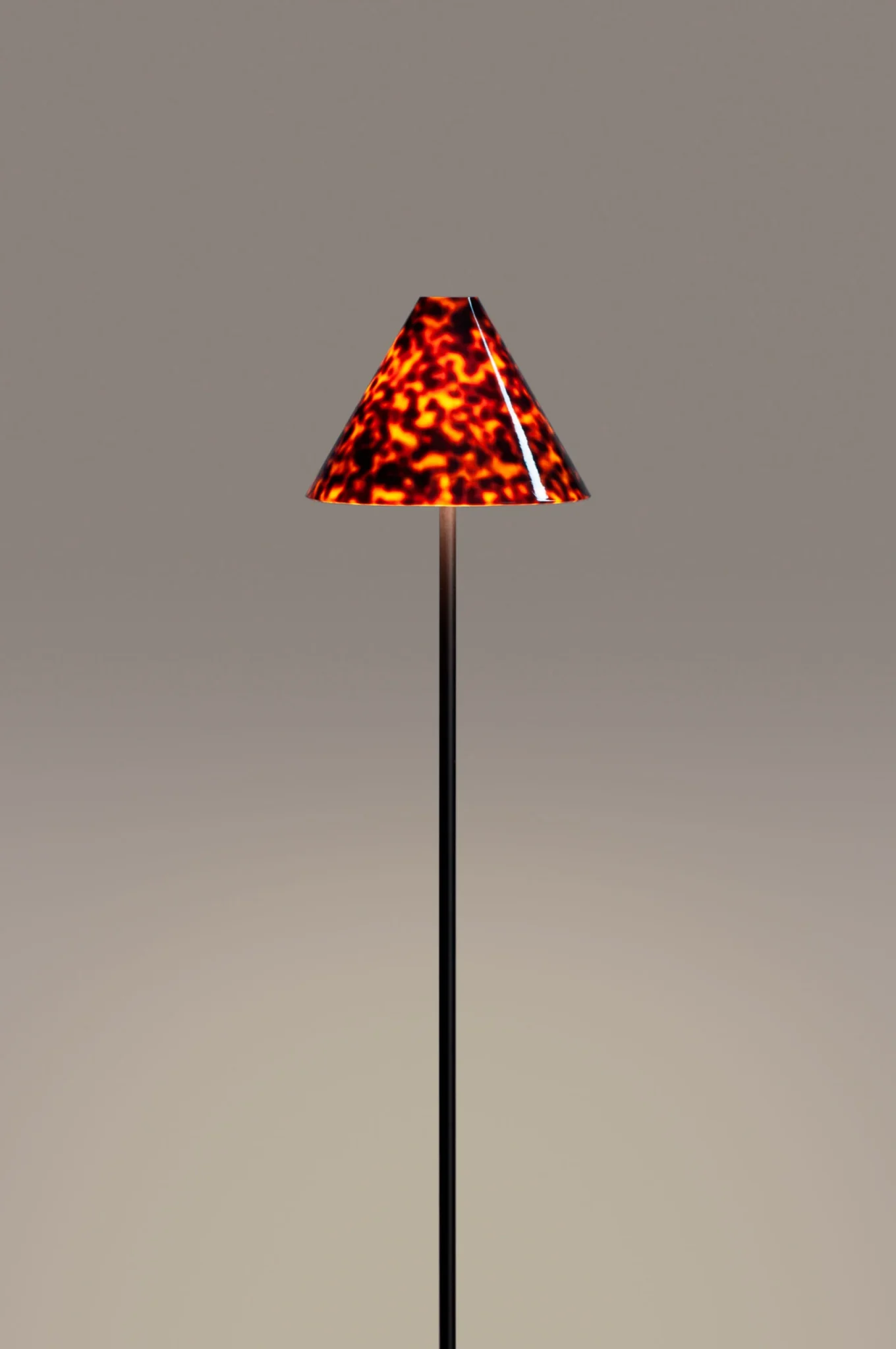 De Pisco vloerlamp Tortoise is ontworpen door Goula en Figuera voor het Spaanse merk Gofi. Het is een vloerlamp met een kap gemaakt van Italiaans celluloseacetaat, een materiaal wat tot nu toe voornamelijk werd gebruikt voor de productie van luxe brillen. De handmatige verwerking van het acetaat zorgt ervoor dat er geen twee stukken identiek zijn en dat de kleurencombinaties met geen enkel ander materiaal reproduceerbaar zijn. Hierdoor is elke kap van de Pisco lamp uniek en spectaculair. De diameter van de kap is 20 cm, de hoogte van de lamp is 134 cm en de lengte van de zwarte kabel met aan/uit schakelaar is 200 cm. De Pisco vloerlamp is ook verkrijgbaar met een kap in Havana Sand of Horn.